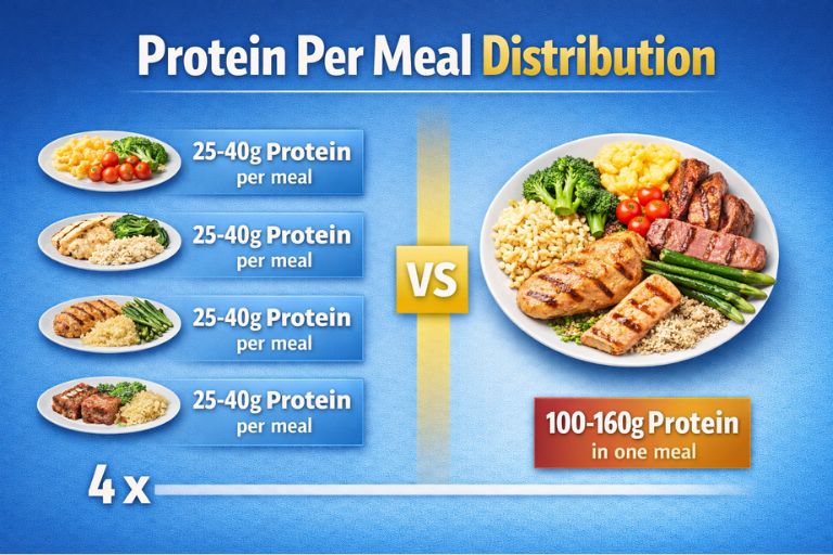 This allows you to repeatedly stimulate muscle protein synthesis throughout the day, rather than trying to overload it in one sitting.