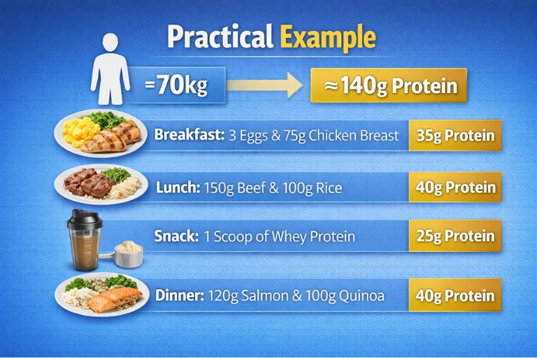 If you’re in a calorie surplus (bulking), protein needs are slightly lower — because your body already has enough energy to support growth.